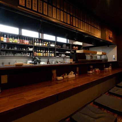 シックで落ち着いた店内は、木の温もりが感じられ、カウンター越しに料理人の技を楽しみながら、心安らぐひとときを過ごせる空間です。